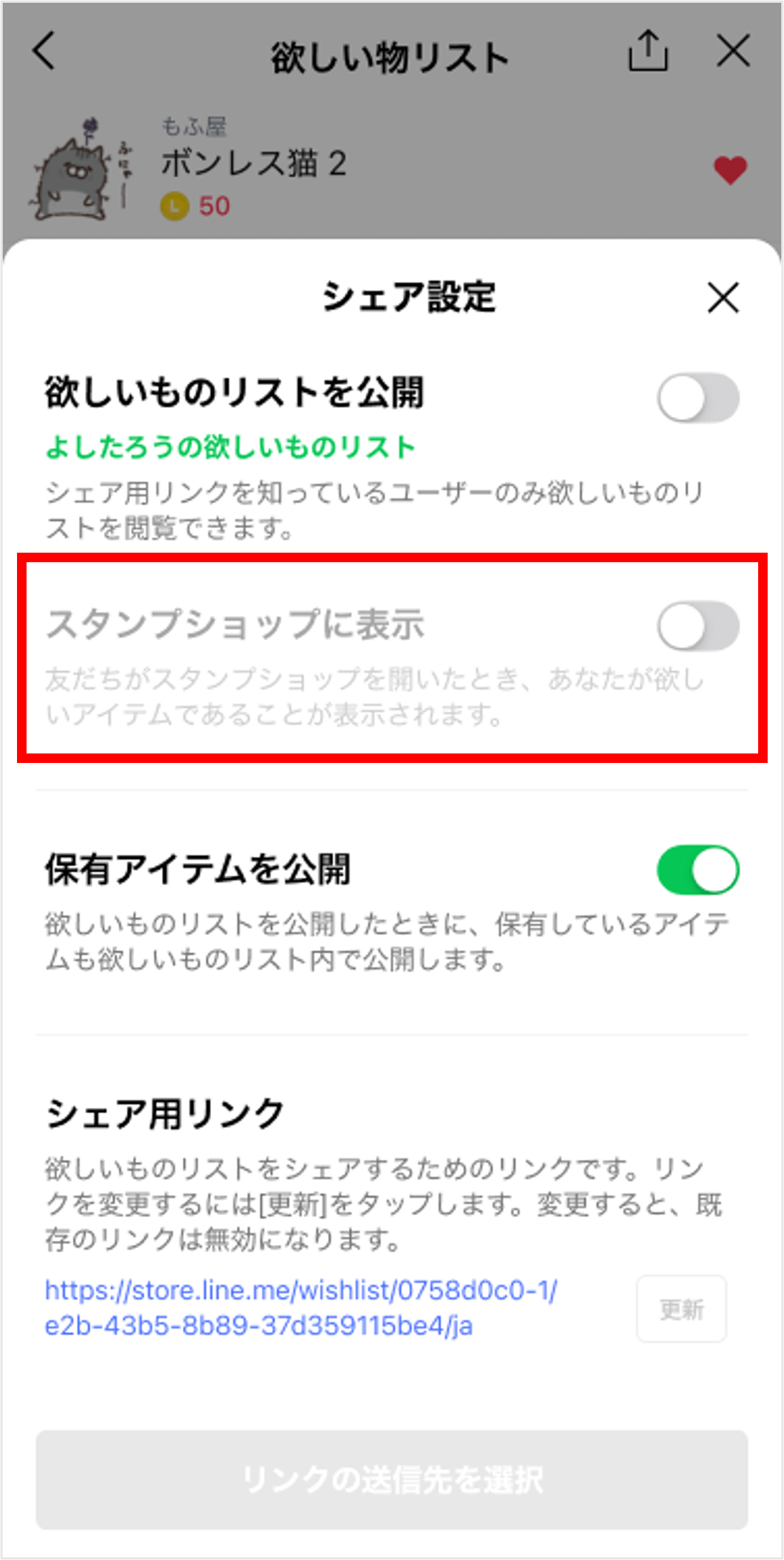 ※[保有アイテムを公開]と[スタンプショップに表示]のオン/オフの設定も可能です